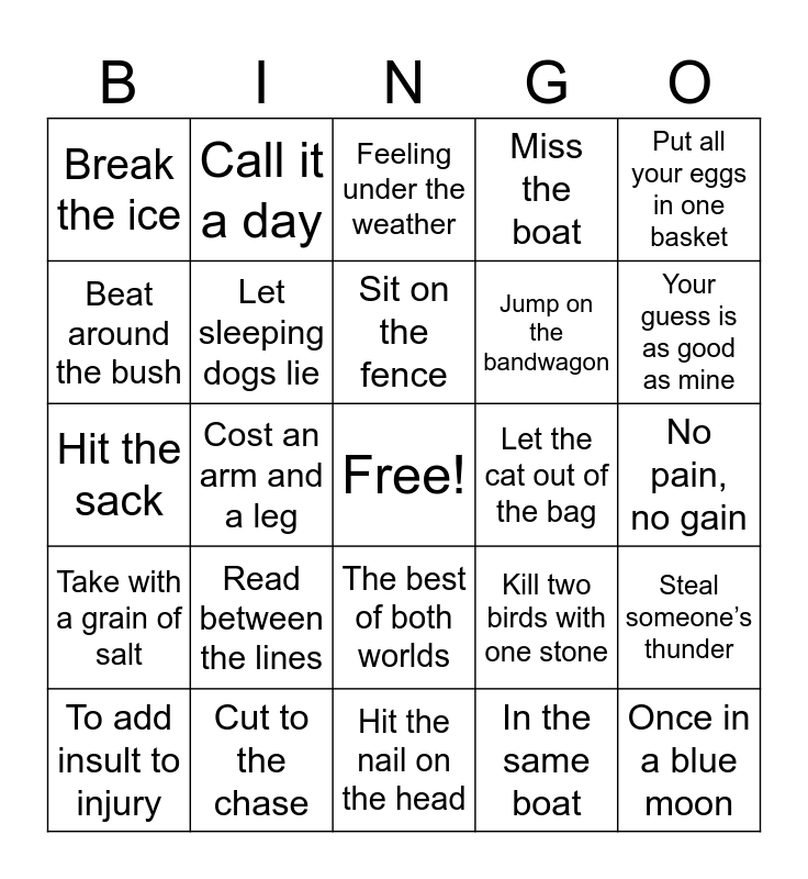 This bingo card has a free space and 49 words: A blessing in disguise, Butterflies in your stomach, Devil’s advocate, In the same boat, No pain, no gain, A dime a dozen, Call it a day, Don’t judge a book by its cover, Jump on the bandwagon, On the ball, Beat around the bush, Cost an arm and a leg, Kill two birds with one stone, Once in a blue moon, Bite the bullet, Cry over spilled milk, Feeling under the weather, Let the cat out of the bag, Piece of cake, Break the ice, Cut to the chase, Hit the nail on the head, Miss the boat, Put all your eggs in one basket, Rain on someone’s parade, Read between the lines, Sit on the fence, Speak of the devil, Steal someone’s thunder, Take with a grain of salt, The ball is in your court, The best of both worlds, Throw in the towel, Time flies when you’re having fun, To add insult to injury, Under the weather, When pigs fly, You can’t judge a book by its cover, Your guess is as good as mine, Zip your lips, Barking up the wrong tree, Burning the midnight oil, Cutting corners, Every cloud has a silver lining, Hit the sack, Let sleeping dogs lie, Make a mountain out of a molehill, Put the cart before the horse and Throw caution to the wind.