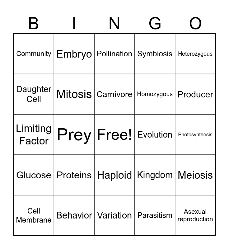 This bingo card has a free space and 24 words: Proteins, Behavior, Carnivore, Cell Membrane, Heterozygous, Community, Daughter Cell, Embryo, Evolution, Haploid, Homozygous, Limiting Factor, Kingdom, Meiosis, Mitosis, Parasitism, Photosynthesis, Pollination, Producer, Prey, Asexual reproduction, Glucose, Symbiosis and Variation.