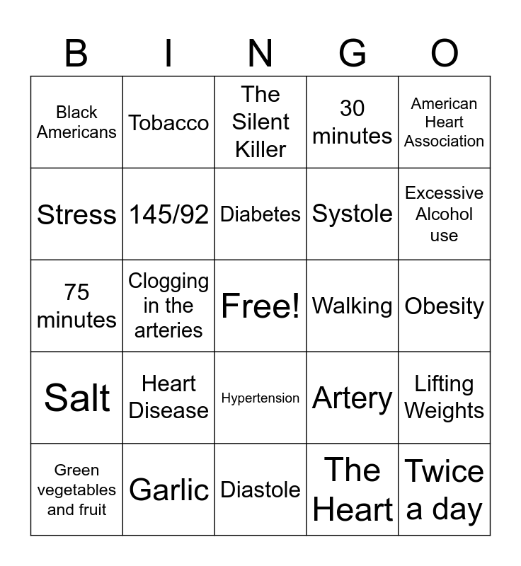 This bingo card has a free space and 27 words: Artery, Vein, Systole, Diastole, Stress, The Silent Killer, Tobacco, Salt, Walking, Lifting Weights, 75 minutes, 30 minutes, Green vegetables and fruit, Garlic, Excessive Alcohol use, 118/80, 145/92, Diabetes, Heart Disease, Black Americans, Obesity, The Heart, Clogging in the arteries, Twice a day, Hypertension, American Heart Association and Cholesterol.