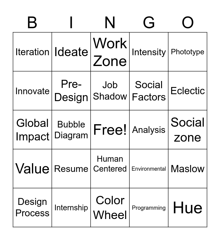 This bingo card has a free space and 24 words: Resume, Internship, Job Shadow, Design Process, Phototype, Iteration, Innovate, Ideate, Analysis, Human Centered, Social Factors, Global Impact, Environmental, Maslow, Pre-Design, Programming, Social zone, Work Zone, Eclectic, Bubble Diagram, Hue, Value, Intensity and Color Wheel.