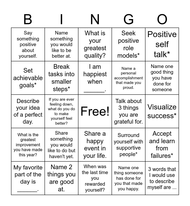 This bingo card has a free space and 24 words: Share something you would like to do but haven't yet., Name 2 things you are good at., I am happiest when ______., My favorite part of the day is ______., Positive self talk*, Say something positive about yourself., Set achievable goals*, Name something you would like to be better at., Talk about 3 things you are grateful for., Share a happy event in your life., Name a personal accomplishment that made you proud., Describe your idea of a perfect day., Surround yourself with supportive people*, Accept and learn from failures*, Break tasks into smaller steps*, Name one thing someone has done for you that made you happy., Visualize success*, What is your greatest quality?, Name one good thing you have done for someone, If you are ever feeling down, what do you do to make yourself feel better?, 3 words that I would use to describe myself are ..., What is the greatest improvement you have made this year?, Seek positive role models* and When was the last time you rewarded yourself?.
