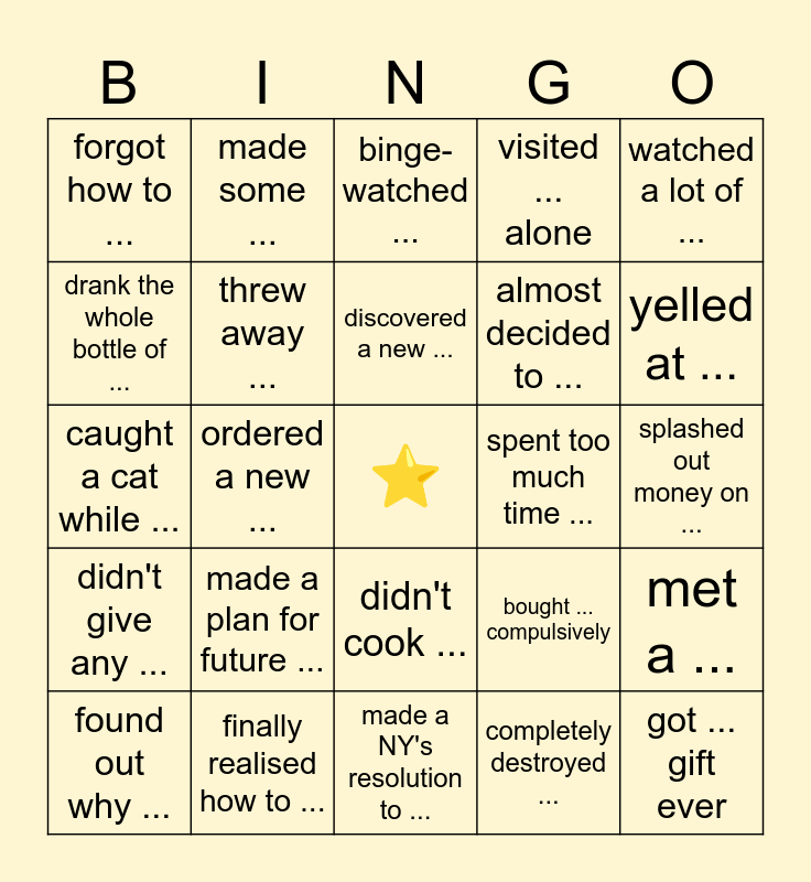 This bingo card has a free space and 24 words: made a plan for future ..., finally realised how to ..., discovered a new ..., found out why ..., watched a lot of ..., forgot how to ..., drank the whole bottle of ..., made some ..., spent too much time ..., didn't cook ..., almost decided to ..., caught a cat while ..., bought ... compulsively, met a ..., threw away ..., completely destroyed ..., splashed out money on ..., binge-watched ..., yelled at ..., ordered a new ..., got ... gift ever, didn't give any ..., visited ... alone and made a NY's resolution to ....