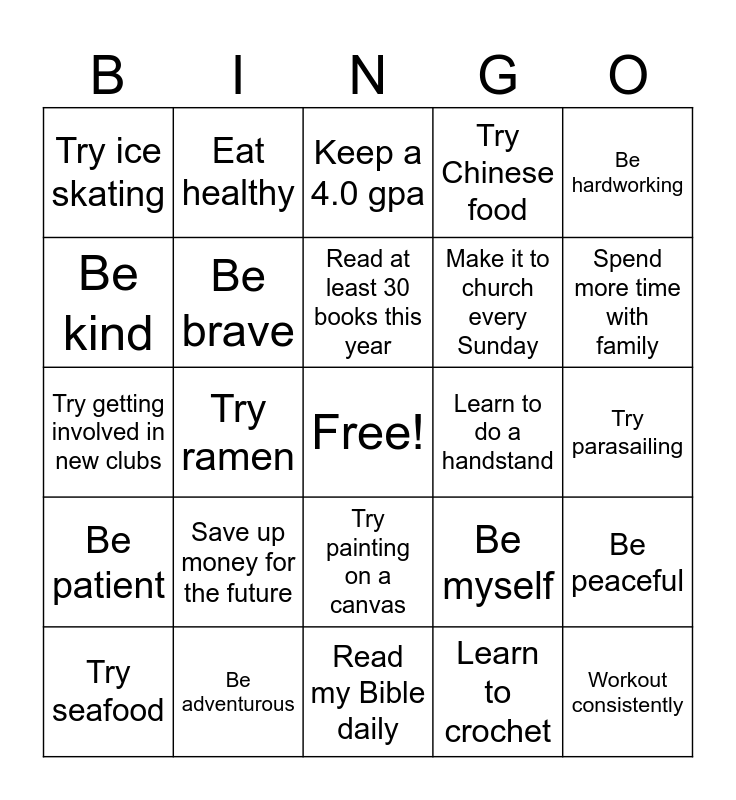 This bingo card has a free space and 24 words: Save up money for the future, Be adventurous, Read at least 30 books this year, Try seafood, Be hardworking, Try ice skating, Be kind, Eat healthy, Learn to do a handstand, Try painting on a canvas, Make it to church every Sunday, Try getting involved in new clubs, Be myself, Be peaceful, Be brave, Learn to crochet, Try parasailing, Keep a 4.0 gpa, Spend more time with family, Try ramen, Workout consistently, Be patient, Try Chinese food and Read my Bible daily.