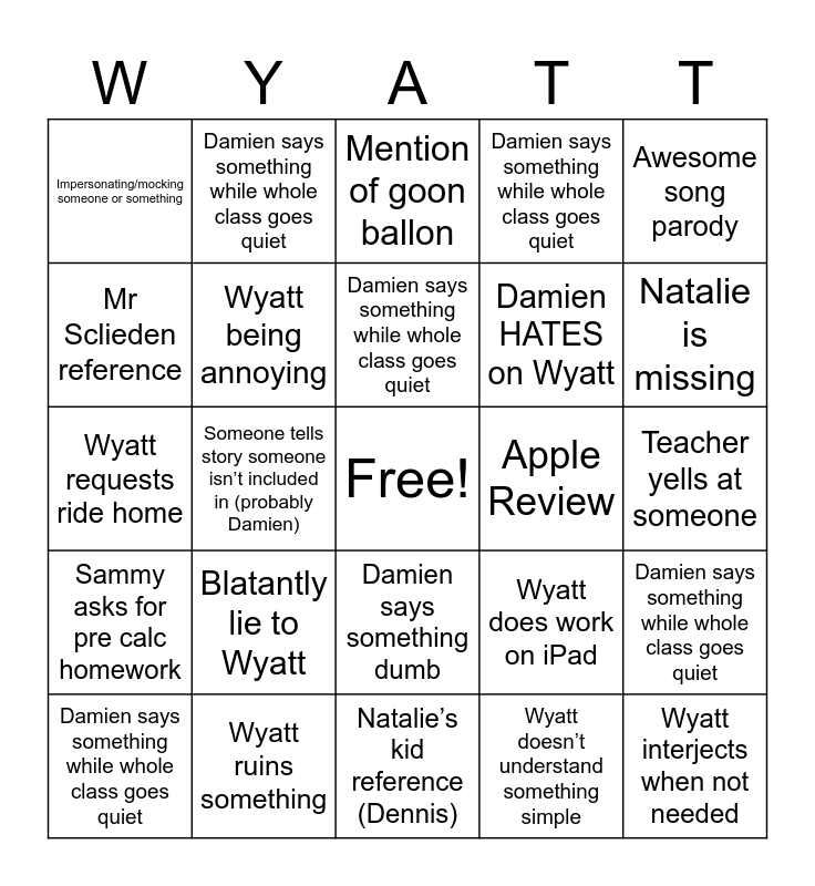 This bingo card has a free space and 29 words: Damien says something while whole class goes quiet, “I bet money on that / I just got __ from __”, Someone tells story someone isn’t included in (probably Damien), Noah plays one of his splendid songs, Impersonating/mocking someone or something, Mention of goon ballon, Wyatt being annoying, Blatantly lie to Wyatt, Apple Review, Wyatt ruins something, Teacher yells at someone, Wyatt interjects when not needed, Natalie’s kid reference (Dennis), Wyatt doesn’t understand something simple, Natalie is missing, Damien is on his phone before Noah or Natalie get there, Damien says something dumb, Sammy asks for pre calc homework, Awesome song parody, Wyatt requests ride home, Wyatt does work on iPad, Wyatt laughing at joke that was not a joke/wasn’t funny, Damien HATES on Wyatt, Mr Sclieden reference, Damien says something while whole class goes quiet, Damien says something while whole class goes quiet, Damien says something while whole class goes quiet, Damien says something while whole class goes quiet and Damien says something while whole class goes quiet.
