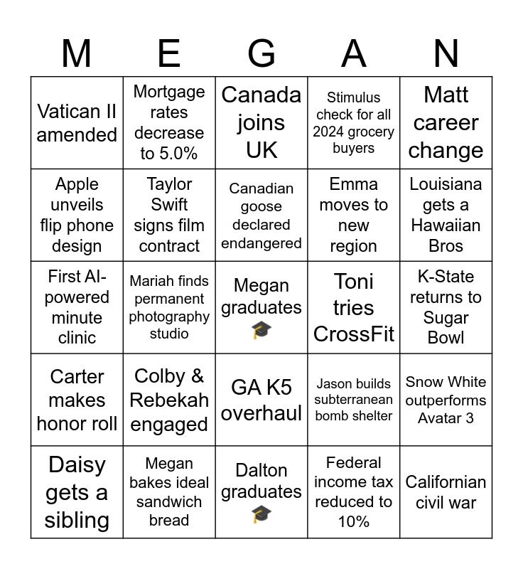 This bingo card has a free space and 24 words: Colby & Rebekah engaged, Megan bakes ideal sandwich bread, Canadian goose declared endangered, Daisy gets a sibling, Matt career change, Vatican II amended, Apple unveils flip phone design, Mortgage rates decrease to 5.0%, Toni tries CrossFit, GA K5 overhaul, Emma moves to new region, First AI-powered minute clinic, Jason builds subterranean bomb shelter, Snow White outperforms Avatar 3, Taylor Swift signs film contract, Federal income tax reduced to 10%, K-State returns to Sugar Bowl, Canada joins UK, Louisiana gets a Hawaiian Bros, Mariah finds permanent photography studio, Californian civil war, Carter makes honor roll, Stimulus check for all 2024 grocery buyers and Dalton graduates 🎓.