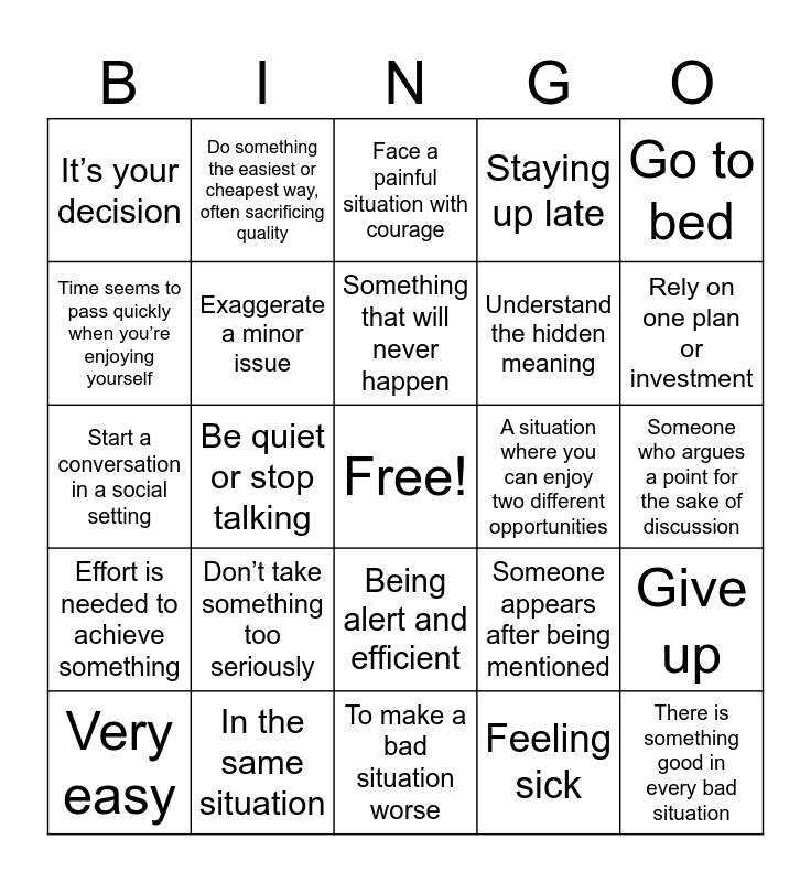 This bingo card has a free space and 49 words: Take a risk without worrying about the consequences, There is something good in every bad situation, I have no idea, To make a bad situation worse, Don’t take something too seriously, Do things in the wrong order., Do something the easiest or cheapest way, often sacrificing quality, Don’t judge things by their appearance, Time seems to pass quickly when you’re enjoying yourself, Take credit for someone else’s idea, Exaggerate a minor issue, Staying up late, Give up, Someone appears after being mentioned, Avoid interfering in a situation that is currently calm, Pursuing a mistaken or misguided course of action, Something that will never happen, A situation where you can enjoy two different opportunities, Avoid making a decision, Go to bed, Be quiet or stop talking, Feeling sick, It’s your decision, Understand the hidden meaning, Spoil someone’s plans, Rely on one plan or investment, Very easy, Rarely, Being alert and efficient, Effort is needed to achieve something, Miss an opportunity, Reveal a secret, Accomplish two things at once, Join others in doing something trendy, In the same situation, Do or say something exactly right, Feeling sick, Don’t judge someone or something by appearance, Someone who argues a point for the sake of discussion, Get to the point, Worry about something that can’t be undone, Very expensive, Stop working on something, Feeling nervous, Start a conversation in a social setting, Face a painful situation with courage, Avoid saying something directly, Something common and of little value and Something good that isn’t recognized at first.