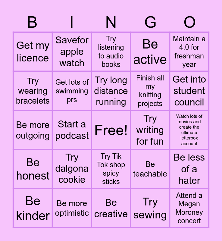 This bingo card has a free space and 24 words: Try dalgona cookie, Be more optimistic, Try long distance running, Be kinder, Maintain a 4.0 for freshman year, Get my licence, Try wearing bracelets, Savefor apple watch, Try writing for fun, Try Tik Tok shop spicy sticks, Finish all my knitting projects, Be more outgoing, Be teachable, Be less of a hater, Get lots of swimming prs, Try sewing, Watch lots of movies and create the ultimate letterbox account, Try listening to audio books, Get into student council, Start a podcast, Attend a Megan Moroney concert, Be honest, Be active and Be creative.