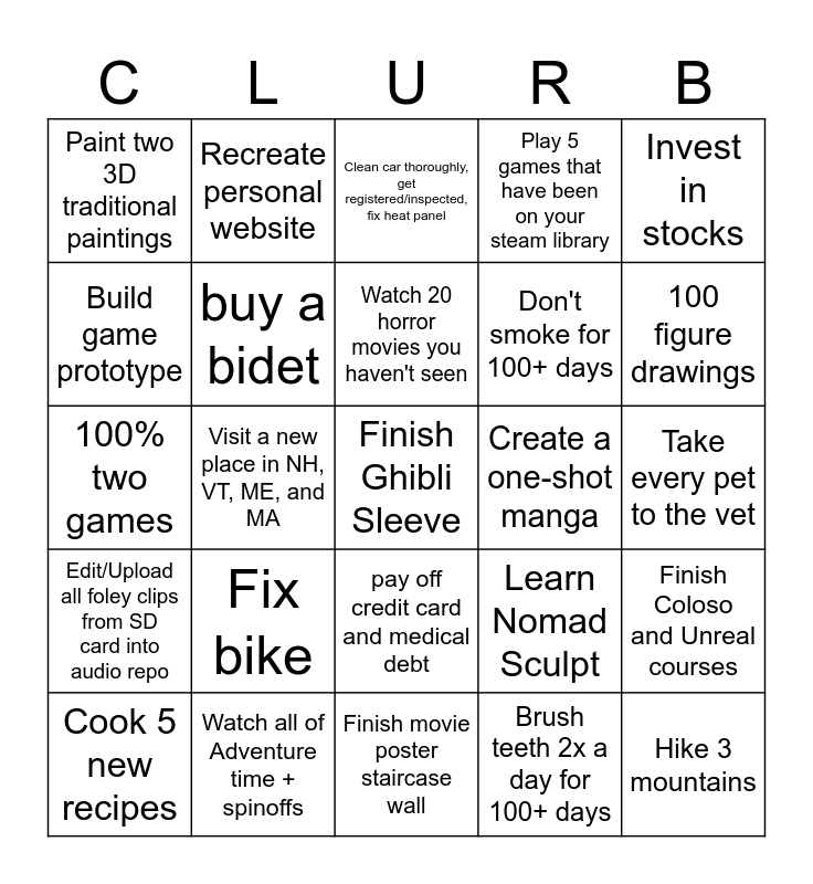 This bingo card has a free space and 24 words: Fix bike, Watch all of Adventure time + spinoffs, Watch 20 horror movies you haven't seen, Cook 5 new recipes, Invest in stocks, Paint two 3D traditional paintings, Build game prototype, Recreate personal website, Create a one-shot manga, pay off credit card and medical debt, Don't smoke for 100+ days, 100% two games, Learn Nomad Sculpt, Finish Coloso and Unreal courses, buy a bidet, Brush teeth 2x a day for 100+ days, Take every pet to the vet, Clean car thoroughly, get registered/inspected, fix heat panel, 100 figure drawings, Visit a new place in NH, VT, ME, and MA, Hike 3 mountains, Edit/Upload all foley clips from SD card into audio repo, Play 5 games that have been on your steam library and Finish movie poster staircase wall.