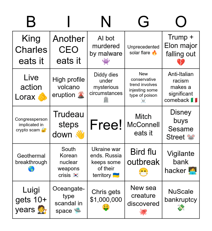This bingo card has a free space and 24 words: South Korean nuclear weapons crisis ð°ð·, Oceangate-type scandal in space ðļ, Diddy dies under mysterious circumstances ðŠĶ, Luigi gets 10+ years ð§ââïļ, Trump + Elon major falling out ð, King Charles eats it, Live action Lorax ðŦĩ, Another CEO eats it, Mitch McConnell eats it, Ukraine war ends. Russia keeps some of their territory ðšðĶ, New conservative trend involves injesting some type of poison â ïļ, Congressperson implicated in crypto scam ð, Bird flu outbreak ð·, Vigilante bank hacker ð§âðŧ, High profile volcano eruption ð, New sea creature discovered ð, Disney buys Sesame Street ð, AI bot murdered by malware ðū, Anti-Italian racism makes a significant comeback ðŪðđ, Trudeau steps down ð, NuScale bankruptcy ðļ, Geothermal breakthrough ð, Unprecedented solar flare ðĨ and Chris gets $1,000,000 ðĪ.