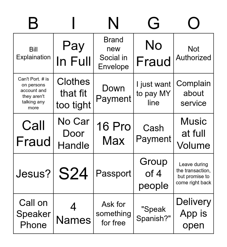 This bingo card has a free space and 24 words: S24, 4 Names, Down Payment, Call on Speaker Phone, Not Authorized, Bill Explaination, Can't Port. # is on persons account and they aren't talking any more, Pay In Full, Cash Payment, Passport, I just want to pay MY line, Call Fraud, Group of 4 people, Leave during the transaction, but promise to come right back, Clothes that fit too tight, "Speak Spanish?", Music at full Volume, Brand new Social in Envelope, Complain about service, No Car Door Handle, Delivery App is open, Jesus?, No Fraud and Ask for something for free.