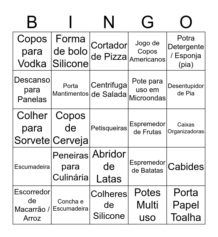 This bingo card has 89 words: Free!, Abridor de Garrafas, Abridor de Latas, Acessórios para Vinho, Açucareiro, Afiador de Facas, Assadeira Anti aderente, Avental, Bacias de Inox (Bowls), Batedor de Ovos, Balde e Pegador de Gelo, Balde de Plástico, Cabides, Caixas Organizadoras, Capacho, Centrifuga de Salada, Cesta para Pães, Cesto de Lixo de Pia, Cesto de Lixo de Banheiro, Cesto para Roupas, Coador de Chá/Leite, Coador de Suco, Colheres de Silicone, Colheres Medida, Colher para Sorvete, Concha e Escumadeira, Conjunto de Chá, Conjunto de Caipirinha, Copos coloridos de Acrílico, Copo Misturador, Jogo de Copos Americanos, Copos de Cerveja, Copos para Wisky, Copos para Vodka, Coqueteleira, Cortador de Pizza, Descanso para Panelas, Descascador de Legumes, Desentupidor de Pia, Escorredor de Macarrão / Arroz, Escumadeira, Escorredor de Talheres, Espremedor de Limão, Espremedor de Alho, Espremedor de Batatas, Espremedor de Frutas, Espátula para Bolo, Faca para Pão, Conjunto de Faquinhas de Patê, Forma de bolo Silicone, Forma de Gelo, Forma de Pudim, Frigideira, Funil pequeno, Galheteiro, Garrafa Térmica, Garfinhos de Petiscos, Jarra para Água, Jarra para Suco, Jogo Americano, Porta Copos, Panelas, Leiteira, Luva Térmica, Mantegueira, Pá de Lixo, Panos de Prato, Pegador de Massas, Pegador de Salada, Peneiras para Culinária, Petisqueiras, Pirex, Pote Hermético, Pote para uso em Microondas, Porta Mantimentos, Potes Multi uso, Porta Guardanapos, Porta Leite, Porta óleo, Porta Papel Toalha, Potra Detergente / Esponja (pia), Porta Temperos, Ralador, Saca Rolhas, Tabua de Vidro, Jogo de Lençol, Colcha, Travesseiro and Kit de Pia (Banheiro).