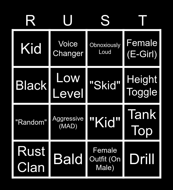 This bingo card has 26 words: Free!, Timestop, Height Toggle, C-Step, Black, Kid, Low Level, Voice Changer, Female Outfit (On Male), Stolen Account, "Random", "Kid", "Son", E-Couple, Tank Top, 1 Word Names, Female (E-Girl), Drill, Obnoxiously Loud, Rust Clan, Aggressive (MAD), White Guy Black Skin, Bald, White Cheer Badge, "Skid" and "SK".