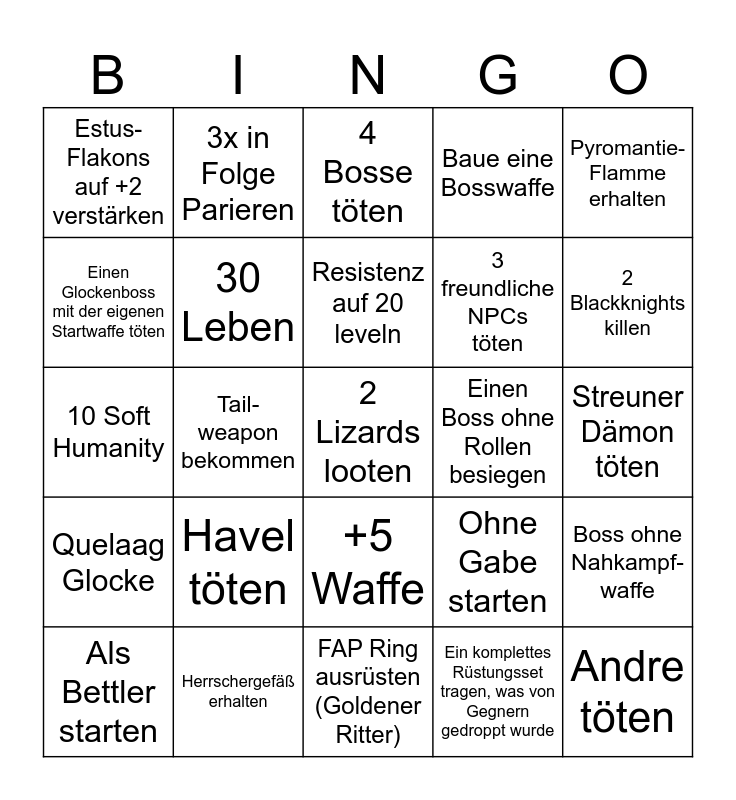 This bingo card has 25 words: Havel töten, FAP Ring ausrüsten (Goldener Ritter), Resistenz auf 20 leveln, Als Bettler starten, Pyromantie-Flamme erhalten, Estus-Flakons auf +2 verstärken, Einen Glockenboss mit der eigenen Startwaffe töten, 3x in Folge Parieren, Einen Boss ohne Rollen besiegen, +5 Waffe, 3 freundliche NPCs töten, 10 Soft Humanity, Ohne Gabe starten, Boss ohne Nahkampf-waffe, 30 Leben, Andre töten, Streuner Dämon töten, 4 Bosse töten, 2 Blackknights killen, Tail-weapon bekommen, 2 Lizards looten, Herrschergefäß erhalten, Quelaag Glocke, Baue eine Bosswaffe and Ein komplettes Rüstungsset tragen, was von Gegnern gedroppt wurde.