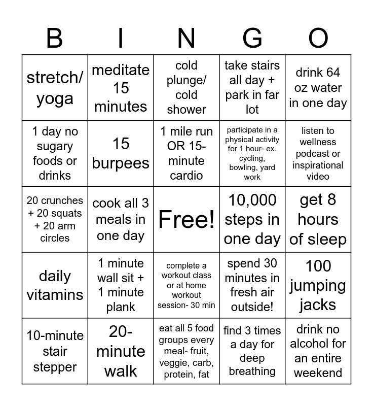 This bingo card has a free space and 24 words: 1 minute wall sit + 1 minute plank, 20-minute walk, 1 mile run OR 15-minute cardio, 10-minute stair stepper, drink 64 oz water in one day, stretch/ yoga, 1 day no sugary foods or drinks, meditate 15 minutes, 10,000 steps in one day, complete a workout class or at home workout session- 30 min, participate in a physical activity for 1 hour- ex. cycling, bowling, yard work, 20 crunches + 20 squats + 20 arm circles, spend 30 minutes in fresh air outside!, 100 jumping jacks, 15 burpees, find 3 times a day for deep breathing, get 8 hours of sleep, cold plunge/ cold shower, listen to wellness podcast or inspirational video, cook all 3 meals in one day, drink no alcohol for an entire weekend, daily vitamins, take stairs all day + park in far lot and eat all 5 food groups every meal- fruit, veggie, carb, protein, fat.
