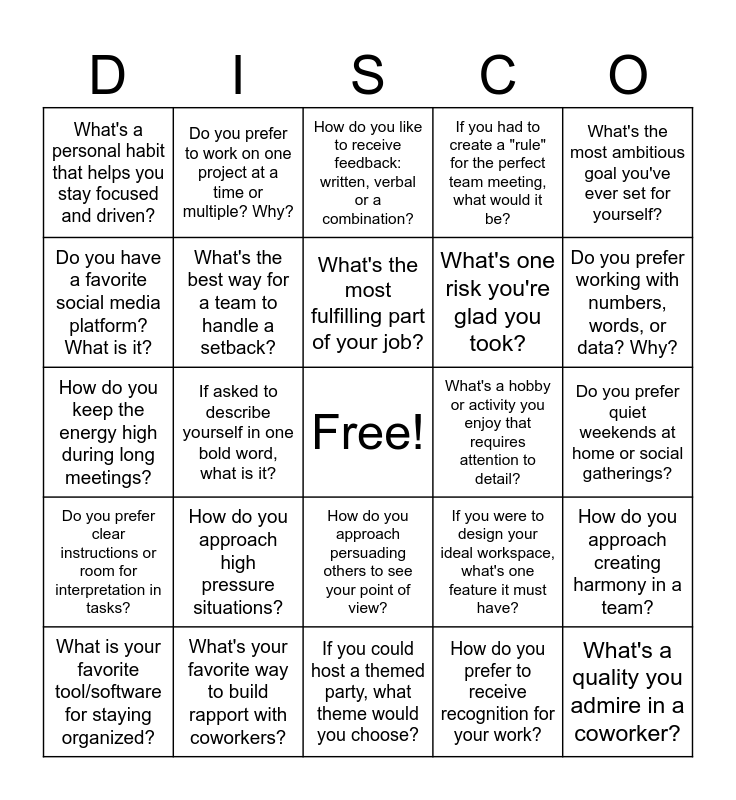 This bingo card has a free space and 24 words: How do you approach high pressure situations?, What's your favorite way to build rapport with coworkers?, What's the most fulfilling part of your job?, What is your favorite tool/software for staying organized?, What's the most ambitious goal you've ever set for yourself?, What's a personal habit that helps you stay focused and driven?, Do you have a favorite social media platform? What is it?, Do you prefer to work on one project at a time or multiple? Why?, What's a hobby or activity you enjoy that requires attention to detail?, How do you approach persuading others to see your point of view?, What's one risk you're glad you took?, How do you keep the energy high during long meetings?, If you were to design your ideal workspace, what's one feature it must have?, How do you approach creating harmony in a team?, What's the best way for a team to handle a setback?, How do you prefer to receive recognition for your work?, Do you prefer quiet weekends at home or social gatherings?, How do you like to receive feedback: written, verbal or a combination?, Do you prefer working with numbers, words, or data? Why?, If asked to describe yourself in one bold word, what is it?, What's a quality you admire in a coworker?, Do you prefer clear instructions or room for interpretation in tasks?, If you had to create a "rule" for the perfect team meeting, what would it be? and If you could host a themed party, what theme would you choose?.