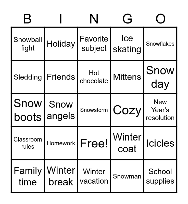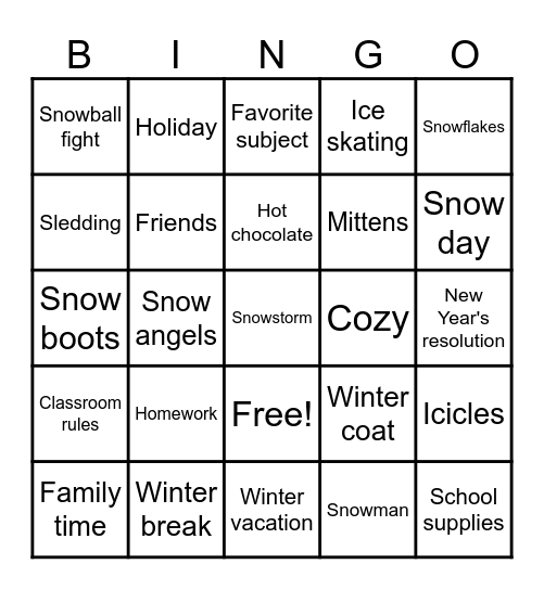 This bingo card has 26 words: Free!, Snowman, Hot chocolate, Winter break, Snowflakes, Snowball fight, Sledding, Holiday, New Year's resolution, Winter coat, Mittens, Snow boots, Icicles, Family time, Snow angels, Winter sports, Ice skating, Classroom rules, Favorite subject, Snowstorm, Snow day, Winter vacation, Cozy, Homework, Friends and School supplies.