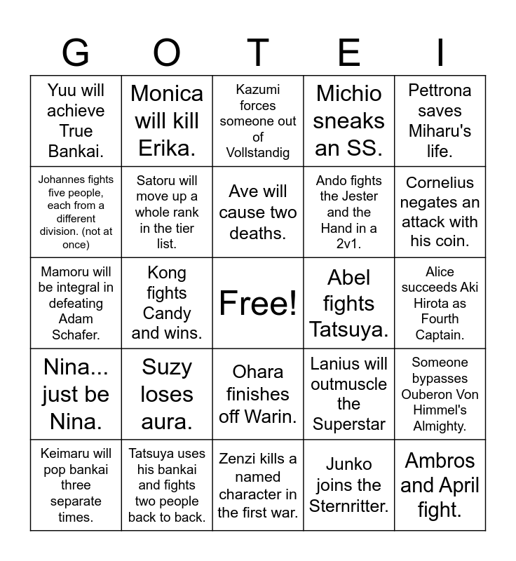 This bingo card has a free space and 24 words: Keimaru will pop bankai three separate times., Suzy loses aura., Ave will cause two deaths., Junko joins the Sternritter., Pettrona saves Miharu's life., Yuu will achieve True Bankai., Monica will kill Erika., Kazumi forces someone out of Vollstandig, Abel fights Tatsuya., Alice succeeds Aki Hirota as Fourth Captain., Mamoru will be integral in defeating Adam Schafer., Satoru will move up a whole rank in the tier list., Lanius will outmuscle the Superstar, Someone bypasses Ouberon Von Himmel's Almighty., Johannes fights five people, each from a different division. (not at once), Tatsuya uses his bankai and fights two people back to back., Zenzi kills a named character in the first war., Michio sneaks an SS., Cornelius negates an attack with his coin., Nina... just be Nina., Kong fights Candy and wins., Ohara finishes off Warin., Ando fights the Jester and the Hand in a 2v1. and Ambros and April fight..