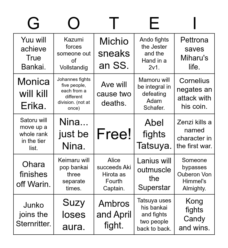 This bingo card has a free space and 24 words: Keimaru will pop bankai three separate times., Suzy loses aura., Ave will cause two deaths., Junko joins the Sternritter., Pettrona saves Miharu's life., Yuu will achieve True Bankai., Monica will kill Erika., Kazumi forces someone out of Vollstandig, Abel fights Tatsuya., Alice succeeds Aki Hirota as Fourth Captain., Mamoru will be integral in defeating Adam Schafer., Satoru will move up a whole rank in the tier list., Lanius will outmuscle the Superstar, Someone bypasses Ouberon Von Himmel's Almighty., Johannes fights five people, each from a different division. (not at once), Tatsuya uses his bankai and fights two people back to back., Zenzi kills a named character in the first war., Michio sneaks an SS., Cornelius negates an attack with his coin., Nina... just be Nina., Kong fights Candy and wins., Ohara finishes off Warin., Ando fights the Jester and the Hand in a 2v1. and Ambros and April fight..