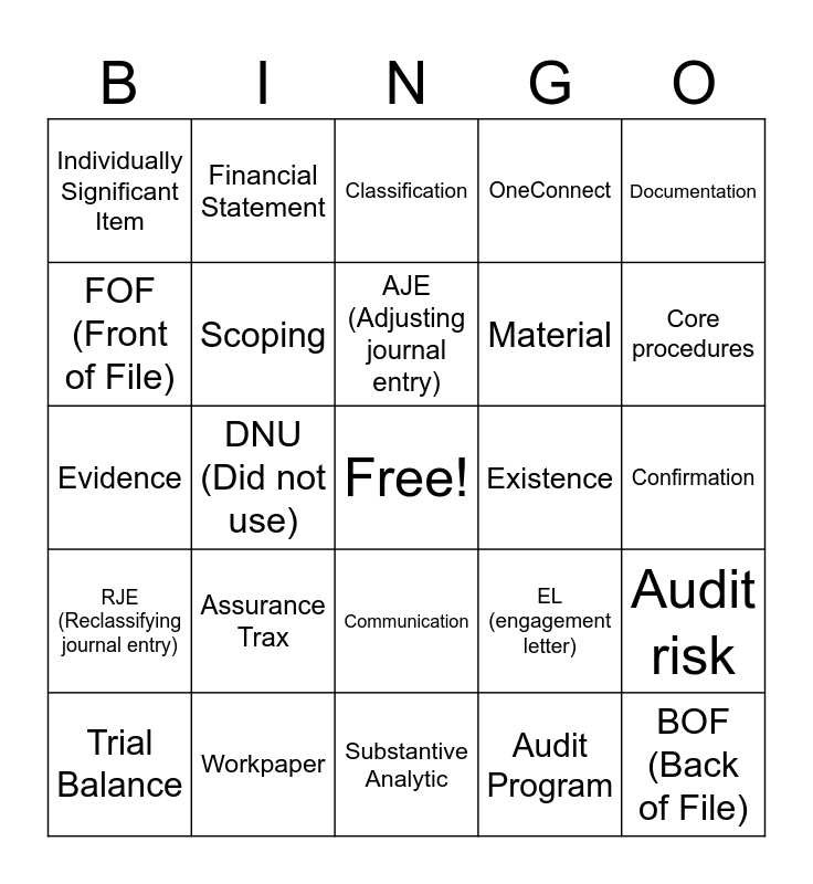 This bingo card has a free space and 42 words: Accounting Research Manager, AJE (Adjusting journal entry), Assertion, Assurance Trax, Audit Program, Audit risk, BOF (Back of File), CFR (Central File Room), Classification, Communication, Confirmation, Core procedures, DNU (Did not use), Documentation, EB (Eide Bailly), EL (engagement letter), Engagement, Evidence, Fieldwork, Financial Statement, FOF (Front of File), Footnote, FY (fiscal year), Individually Significant Item, KC (Knowledge Coach), LFR (local File Room), Material, Not material, PBC (prepared by client), Performance Materiality, PNM (Pass not material), RJE (Reclassifying journal entry), Scoping, Substantive Analytic, Synchronization, Trial Balance, Workpaper, Existence, Completeness, Cutoff, OneConnect and Budget.