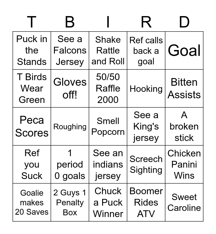 This bingo card has a free space and 24 words: 1 period 0 goals, 2 Guys 1 Penalty Box, 50/50 Raffle 2000, Goalie makes 20 Saves, Goal, Puck in the Stands, T Birds Wear Green, See a Falcons Jersey, See a King's jersey, See an indians jersey, Hooking, Peca Scores, Screech Sighting, Chicken Panini Wins, Gloves off!, Boomer Rides ATV, A broken stick, Shake Rattle and Roll, Bitten Assists, Roughing, Sweet Caroline, Ref you Suck, Ref calls back a goal and Chuck a Puck Winner.