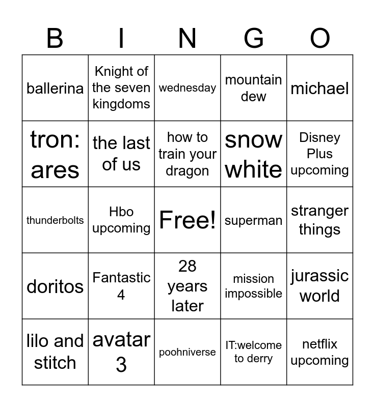 This bingo card has a free space and 24 words: Fantastic 4, avatar 3, how to train your dragon, lilo and stitch, michael, ballerina, tron: ares, Knight of the seven kingdoms, superman, 28 years later, snow white, thunderbolts, mission impossible, jurassic world, the last of us, IT:welcome to derry, stranger things, wednesday, Disney Plus upcoming, Hbo upcoming, netflix upcoming, doritos, mountain dew and poohniverse.
