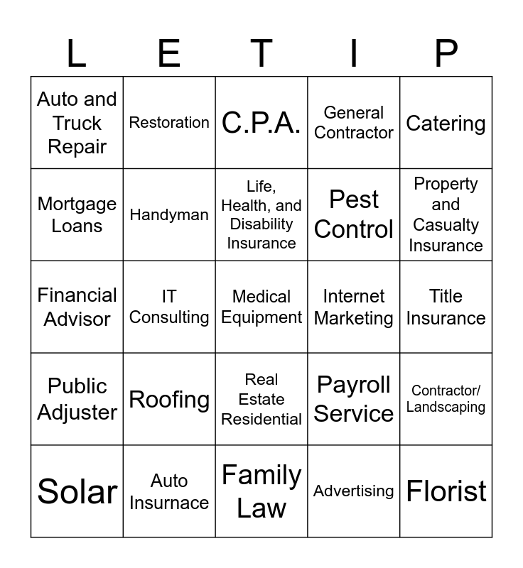 This bingo card has a free space and 24 words: Roofing, Auto Insurnace, Life, Health, and Disability Insurance, Solar, Catering, Auto and Truck Repair, Mortgage Loans, Restoration, Internet Marketing, Real Estate Residential, Pest Control, Financial Advisor, Payroll Service, Contractor/ Landscaping, Handyman, Advertising, Title Insurance, C.P.A., Property and Casualty Insurance, IT Consulting, Florist, Public Adjuster, General Contractor and Family Law.