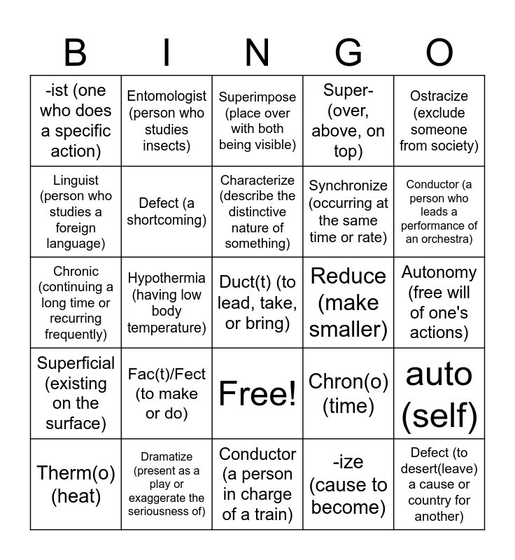 This bingo card has 26 words: Free!, -ize (cause to become), Characterize (describe the distinctive nature of something), Dramatize (present as a play or exaggerate the seriousness of), Ostracize (exclude someone from society), -ist (one who does a specific action), Linguist (person who studies a foreign language), Entomologist (person who studies insects), Autonomy (free will of one's actions), Chron(o) (time), Synchronize (occurring at the same time or rate), Chronic (continuing a long time or recurring frequently), auto (self), Therm(o) (heat), Hypothermia (having low body temperature), Hyperthermia (having body temperature above normal), Super- (over, above, on top), Superficial (existing on the surface), Superimpose (place over with both being visible), Duct(t) (to lead, take, or bring), Conductor (a person who leads a performance of an orchestra), Conductor (a person in charge of a train), Reduce (make smaller), Fac(t)/Fect (to make or do), Defect (a shortcoming) and Defect (to desert(leave) a cause or country for another).