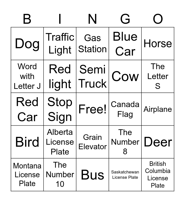This bingo card has a free space and 24 words: Alberta License Plate, The Number 10, Semi Truck, Montana License Plate, Horse, Dog, Word with Letter J, Traffic Light, Canada Flag, Grain Elevator, Cow, Red Car, The Number 8, Deer, Red light, Saskatchewan License Plate, Airplane, Gas Station, The Letter S, Stop Sign, British Columbia License Plate, Bird, Blue Car and Bus.