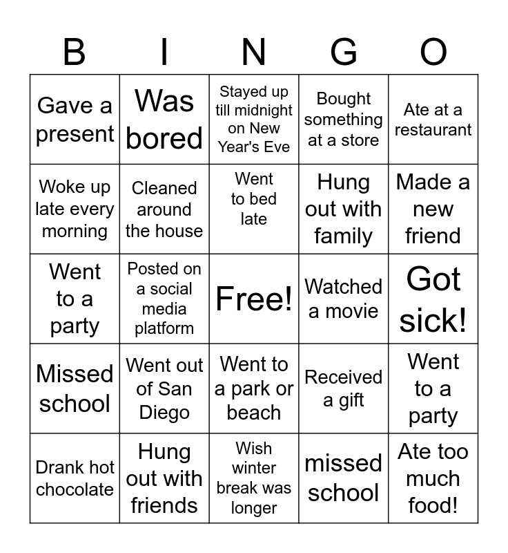 This bingo card has a free space and 24 words: Went out of San Diego, Hung out with friends, Went to bed late, Drank hot chocolate, Ate at a restaurant, Gave a present, Woke up late every morning, Was bored, Watched a movie, Went to a park or beach, Hung out with family, Went to a party, Received a gift, Went to a party, Cleaned around the house, missed school, Got sick!, Stayed up till midnight on New Year's Eve, Made a new friend, Posted on a social media platform, Ate too much food!, Missed school, Bought something at a store and Wish winter break was longer.