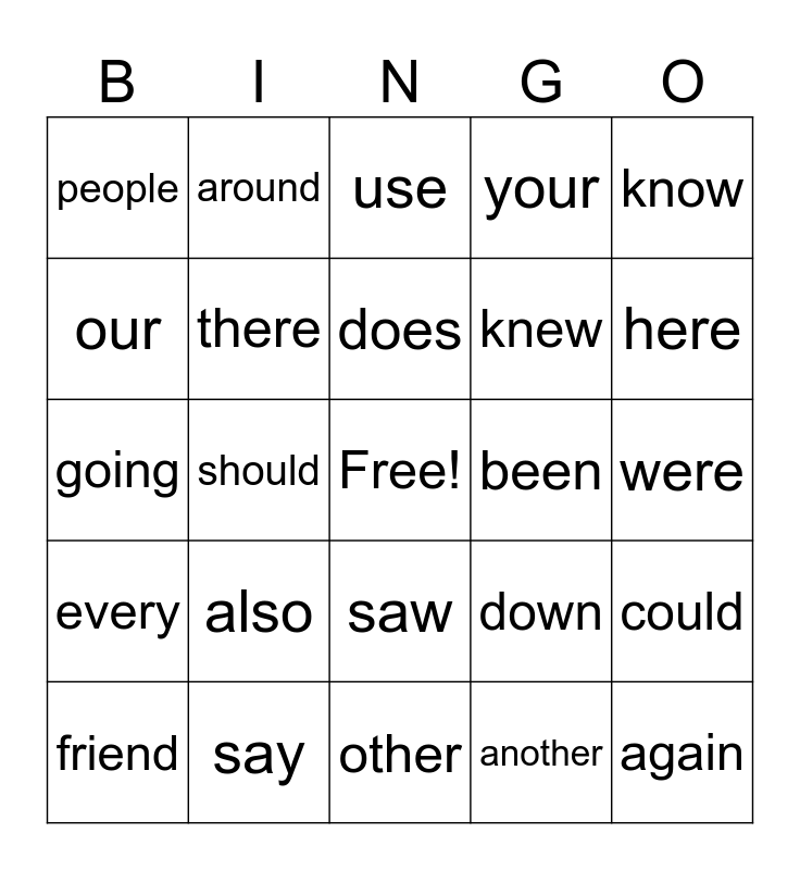 This bingo card has a free space and 24 words: also, say, does, friend, know, people, our, around, been, saw, knew, going, down, could, there, another, were, use, here, should, again, every, your and other.