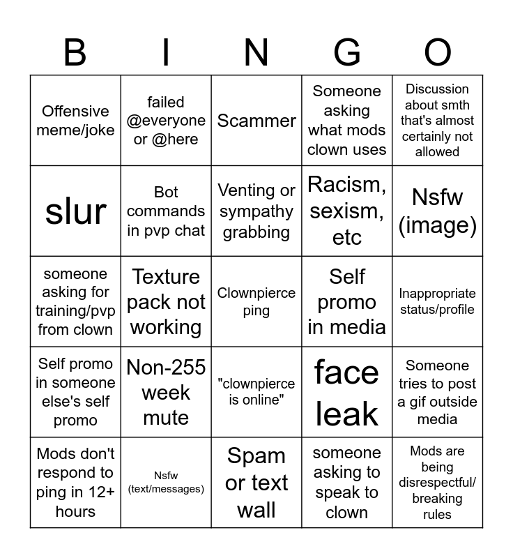 This bingo card has a free space and 38 words: 255 week mute, Moderate-severe rule breaking message/image goes unresolved for 24+ hours, Chat is not speaking english (outside of language threads), Bot commands in pvp chat, Someone tries to post a gif outside media, Non-255 week mute, Venting or sympathy grabbing, Self promo (outside media), Discussion about smth that's almost certainly not allowed, Racism, sexism, etc, Texture pack not working, Someone asking what mods clown uses, Mods are being disrespectful/ breaking rules, Inappropriate status/profile, slur, Self promo in someone else's self promo, Stolen/traced art, Scammer, No mods online, Self promo in media, Offensive meme/joke, Nsfw (text/messages), Nsfw (image), Mods don't respond to ping in 12+ hours, Death threat, Spam or text wall, Someone making other(s) uncomfortable, Someone asking for/advertising a cracked smp, New member breaks rule, (Most likely) an underage user, Inflammatory discussion, "clownpierce is online", someone asking to speak to clown, failed @everyone or @here, harassment, face leak, someone asking for training/pvp from clown and somebody glazing clown.