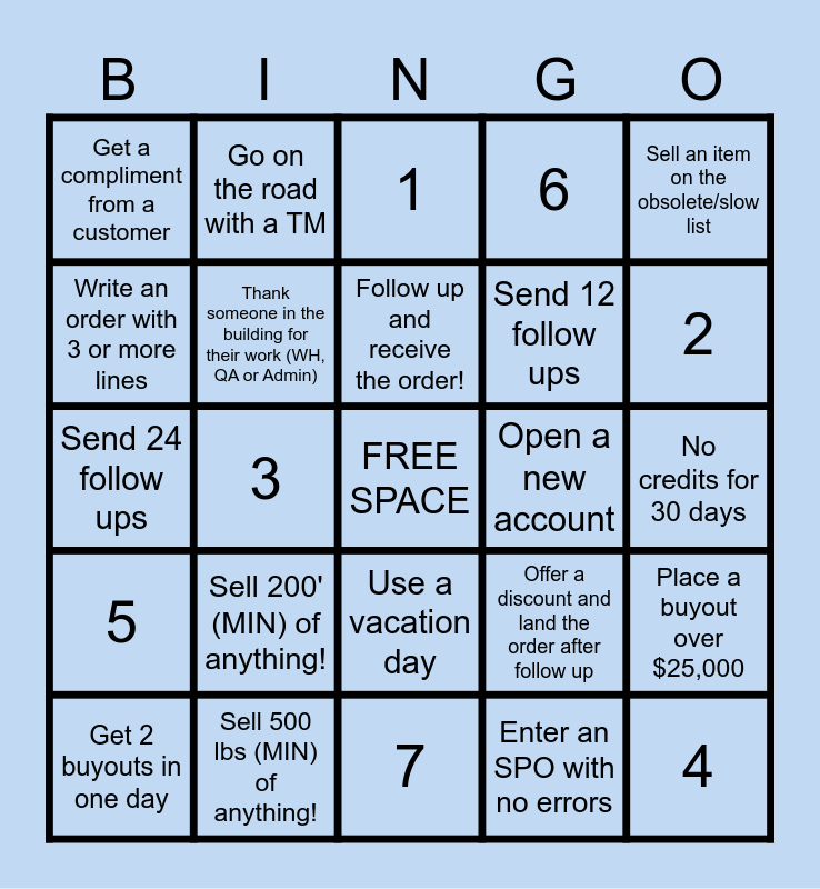 This bingo card has a free space and 24 words: Sell 200' (MIN) of anything!, Sell 500 lbs (MIN) of anything!, Follow up and receive the order!, Get 2 buyouts in one day, Sell an item on the obsolete/slow list, Get a compliment from a customer, Write an order with 3 or more lines, Go on the road with a TM, Open a new account, Use a vacation day, Send 12 follow ups, Send 24 follow ups, Offer a discount and land the order after follow up, Place a buyout over $25,000, Thank someone in the building for their work (WH, QA or Admin), Enter an SPO with no errors, No credits for 30 days, 1, 2, 3, 4, 5, 6 and 7.