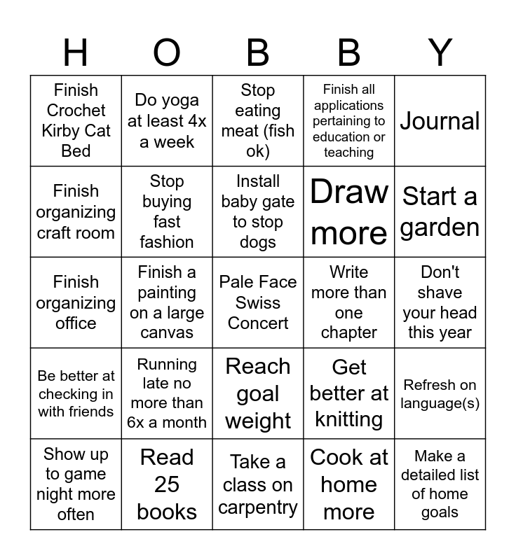 This bingo card has a free space and 24 words: Running late no more than 6x a month, Read 25 books, Install baby gate to stop dogs, Show up to game night more often, Journal, Finish Crochet Kirby Cat Bed, Finish organizing craft room, Do yoga at least 4x a week, Write more than one chapter, Reach goal weight, Draw more, Finish organizing office, Get better at knitting, Refresh on language(s), Stop buying fast fashion, Cook at home more, Don't shave your head this year, Stop eating meat (fish ok), Start a garden, Finish a painting on a large canvas, Make a detailed list of home goals, Be better at checking in with friends, Finish all applications pertaining to education or teaching and Take a class on carpentry.