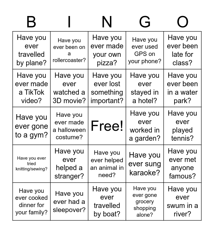 This bingo card has a free space and 24 words: Have you ever cooked dinner for your family?, Have you ever helped a stranger?, Have you ever lost something important?, Have you ever gone grocery shopping alone?, Have you ever been late for class?, Have you ever travelled by plane?, Have you ever been on a rollercoaster?, Have you ever made your own pizza?, Have you ever worked in a garden?, Have you ever played tennis?, Have you ever gone to a gym?, Have you ever watched a 3D movie?, Have you ever sung karaoke?, Have you ever met anyone famous?, Have you ever made a TikTok video?, Have you ever had a sleepover?, Have you ever travelled by boat?, Have you ever used GPS on your phone?, Have you ever been in a water park?, Have you ever tried knitting/sewing?, Have you ever made a halloween costume?, Have you ever helped an animal in need?, Have you ever stayed in a hotel? and Have you ever swum in a river?.