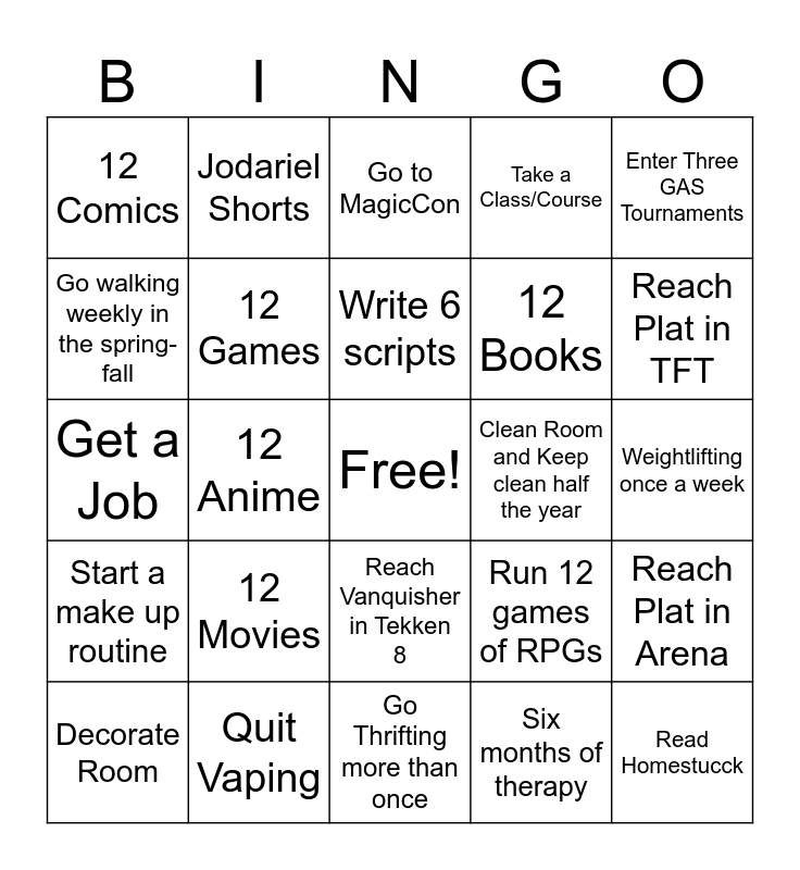 This bingo card has a free space and 24 words: 12 Movies, Quit Vaping, Write 6 scripts, Decorate Room, Enter Three GAS Tournaments, 12 Comics, Go walking weekly in the spring-fall, Jodariel Shorts, Clean Room and Keep clean half the year, Reach Vanquisher in Tekken 8, 12 Books, Get a Job, Run 12 games of RPGs, Reach Plat in Arena, 12 Games, Six months of therapy, Weightlifting once a week, Go to MagicCon, Reach Plat in TFT, 12 Anime, Read Homestucck, Start a make up routine, Take a Class/Course and Go Thrifting more than once.