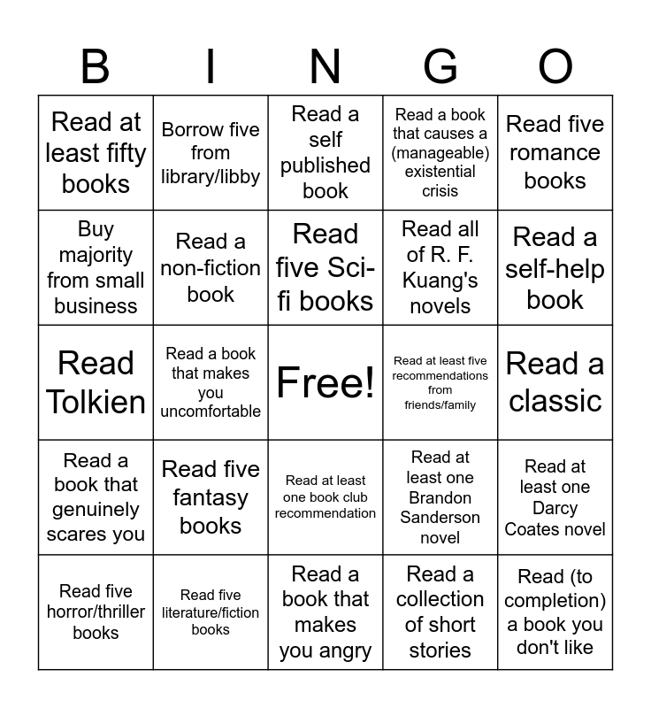 This bingo card has a free space and 24 words: Read five fantasy books, Read five literature/fiction books, Read five Sci-fi books, Read five horror/thriller books, Read five romance books, Read at least fifty books, Buy majority from small business, Borrow five from library/libby, Read at least five recommendations from friends/family, Read at least one book club recommendation, Read all of R. F. Kuang's novels, Read Tolkien, Read at least one Brandon Sanderson novel, Read at least one Darcy Coates novel, Read a non-fiction book, Read a collection of short stories, Read a classic, Read a self published book, Read a self-help book, Read a book that makes you uncomfortable, Read (to completion) a book you don't like, Read a book that genuinely scares you, Read a book that causes a (manageable) existential crisis and Read a book that makes you angry.