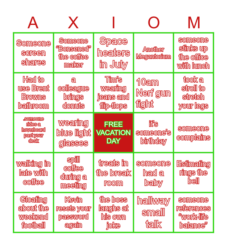 This bingo card has a free space and 29 words: Gloating about the weekend football, Moldy sandwich in the fridge, wearing blue light glasses, Stand-up desks, Someone screen shares, Space heaters in July, a colleague brings donuts, spill coffee during a meeting, it’s someone’s birthday, Kevin resets your password again, someone complains, someone references “work-life balance”, the boss laughs at his own joke, hallway small talk, took a stroll to stretch your legs, Teams meeting, treats in the break room, walking in late with coffee, someone stinks up the office with lunch, .someone rides a hoverboard past your desk, someone had a baby, Grant goes golfing with a client, 10am Nerf gun fight, Had to use Brent Browns bathroom, Another Megantorium, Someone “Bonsened” the coffee maker, Estimating rings the bell, Tim’s wearing jeans and flip-flops and Someone fell asleep during a meeting.