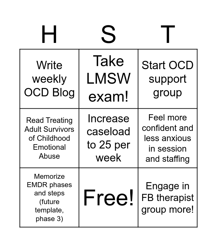 This bingo card has 10 words: Free!, Start OCD support group, Write weekly OCD Blog, Increase caseload to 25 per week, Read Treating Adult Survivors of Childhood Emotional Abuse, Memorize EMDR phases and steps (future template, phase 3), Take LMSW exam!, Go to monthly EMDR consultations, Feel more confident and less anxious in session and staffing and Engage in FB therapist group more!.