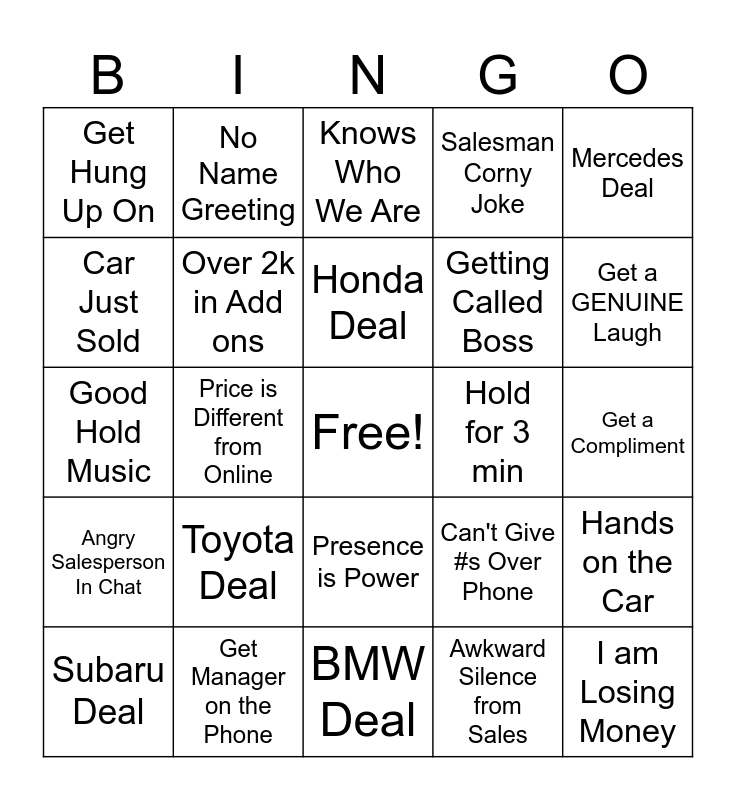 This bingo card has a free space and 25 words: Toyota Deal, BMW Deal, Honda Deal, Subaru Deal, Mercedes Deal, Get Hung Up On, Car Just Sold, No Name Greeting, Hold for 3 min, Presence is Power, Getting Called Boss, Good Hold Music, Can't Give #s Over Phone, Hands on the Car, Over 2k in Add ons, More than two transfers, Get a Compliment, Knows Who We Are, Get a GENUINE Laugh, Price is Different from Online, I am Losing Money, Get Manager on the Phone, Angry Salesperson In Chat, Salesman Corny Joke and Awkward Silence from Sales.