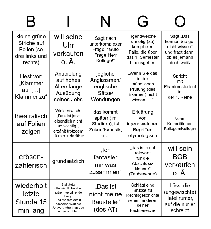 This bingo card has 25 words: grundsätzlich, „Das ist nicht meine Baustelle“ (des AT), jegliche Anglizismen/ englische Sätze/ Wendungen, wiederholt letzte Stunde 15 min lang, Sagt „Das können Sie gar nicht wissen“ und fragt dann, ob es jemand doch weiß, kleine grüne Striche auf Folien (so drei links und rechts), Liest vor: „Klammer auf […] Klammer zu“, will seine Uhr verkaufen o. Ä., Erklärung von irgendwelchen Begriffen etymologisch, „Ich fantasier mir was zusammen“, „Wenn Sie das in der mündlichen Prüfung (des Examen) nicht wissen, …“, theatralisch auf Folien zeigen, „das ist nicht relevant für die Abschluss- klausur“ (Zauberworte), will sein BGB verkaufen o. Ä., Anspielung auf hohes Alter/ lange Ausübung seines Jobs, Lässt die (ungewischte) Tafel runter, auf die nur er schreibt, Nennt Kommilitonen Kollegen/Kollegin, Sagt nach unterkomplexer Frage: "Gute Frage Herr Kollege!", Spricht mit Phantomstudent in der 1. Reihe, Winkt etw. ab, „Das ist jetzt eigentlich nicht so wichtig“, erzählt trotzdem 10 min + darüber, das kommt später (im Studium), ist Zukunftsmusik, etc., Stellt total offensichtliche aber extrem verwirrende Frage und möchte exakt dasselbe Wort als Antwort hören, an das er gedacht hat, erbsen-zählerisch, Irgendwelche unnötig (zu) komplexen Fälle, die über das 1. Semester hinausgehen and Schlägt eine Brücke zu Rechtsgeschichte /einem anderen seiner Fachbereiche.