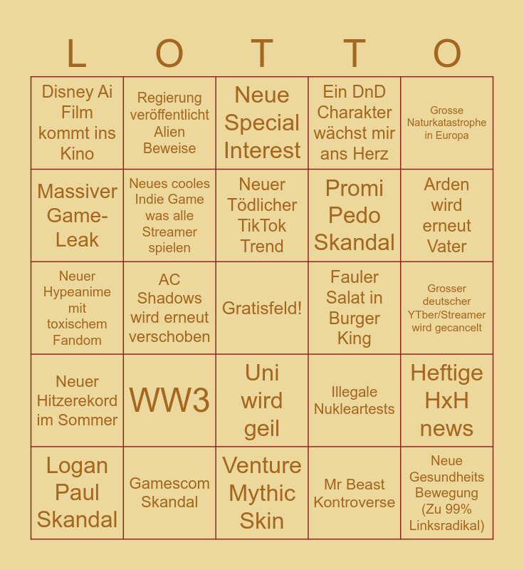 This bingo card has a free space and 24 words: WW3, Gamescom Skandal, Neuer Tödlicher TikTok Trend, Logan Paul Skandal, Grosse Naturkatastrophe in Europa, Disney Ai Film kommt ins Kino, Massiver Game-Leak, Regierung veröffentlicht Alien Beweise, Fauler Salat in Burger King, Uni wird geil, Promi Pedo Skandal, Neuer Hypeanime mit toxischem Fandom, Illegale Nukleartests, Heftige HxH news, Neues cooles Indie Game was alle Streamer spielen, Mr Beast Kontroverse, Grosser deutscher YTber/Streamer wird gecancelt, Neue Special Interest, Arden wird erneut Vater, AC Shadows wird erneut verschoben, Neue Gesundheits Bewegung (Zu 99% Linksradikal), Neuer Hitzerekord im Sommer, Ein DnD Charakter wächst mir ans Herz and Venture Mythic Skin.