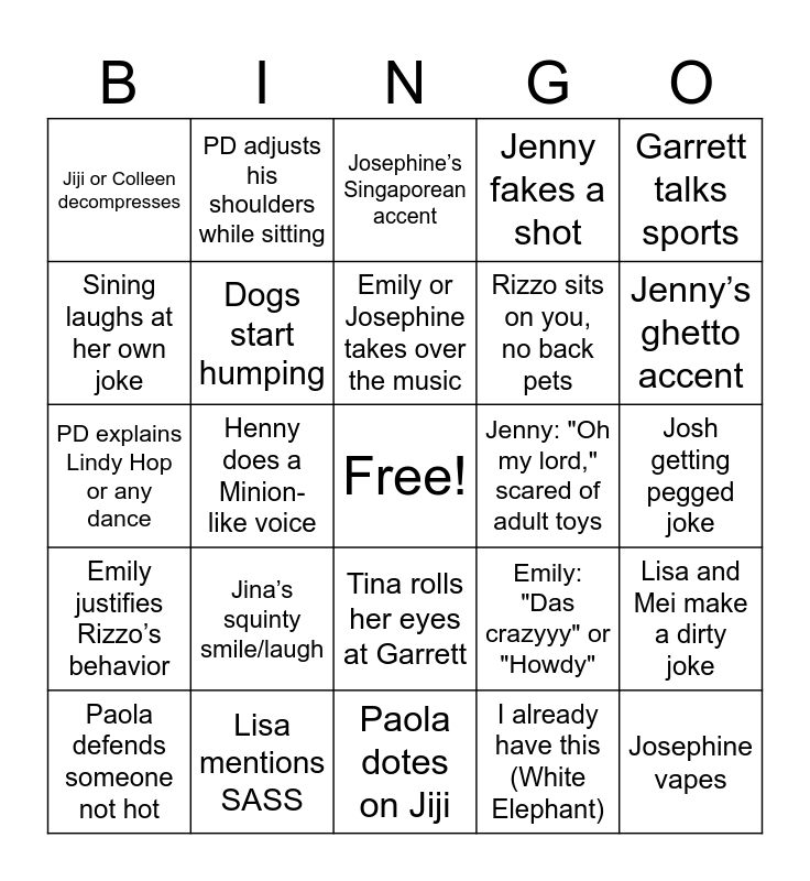 This bingo card has a free space and 36 words: Free Spot (Say Hi to someone new), Colleen: "I'm dead", Cindy shows off her abs, Dogs start humping, Emily: "Das crazyyy" or "Howdy", Emily justifies Rizzo’s behavior, Emily or Josephine takes over the music, Ereka doesn’t understand a joke, Garrett talks sports, Henny and Emily PDA, Henny does a Minion-like voice, Jenny fakes a shot, Jenny says a fake swear, Jenny: "Oh my lord," scared of adult toys, Jenny’s ghetto accent, Jiji or Colleen decompresses, Jina goes 1 hr+ without looking at her phone, Jina’s squinty smile/laugh, Josephine vapes, Josephine’s Singaporean accent, Josh getting pegged joke, Lisa and Mei make a dirty joke, Lisa mentions SASS, Paola defends someone not hot, Paola dotes on Jiji, PD adjusts his shoulders while sitting, PD explains Lindy Hop or any dance, Rizzo and Kanera fight, Rizzo sits on you, no back pets, Sining laughs at her own joke, Sining uses an outdated phrase, Sining mentions Titty Tub of Truth, I already have this (White Elephant), Tina rolls her eyes at Garrett, Tina puts her hand on you and Someone phone does less than <20%.