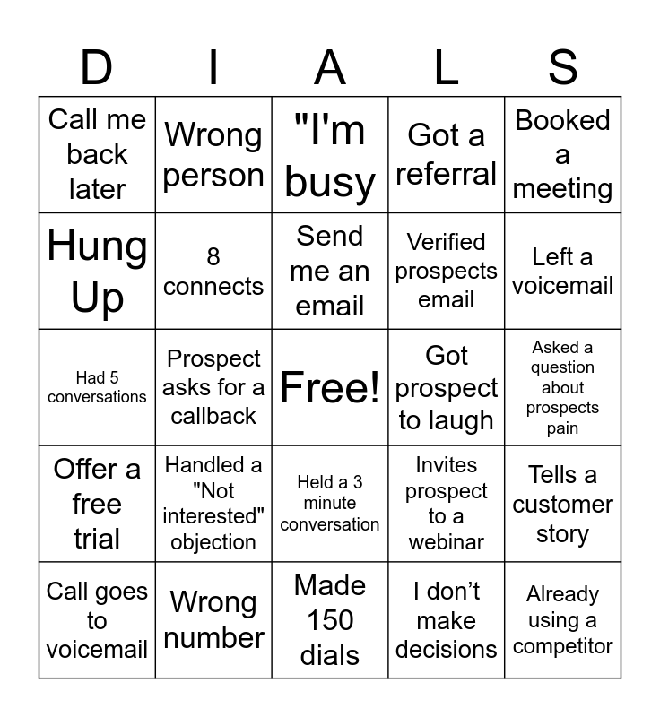 This bingo card has a free space and 24 words: Handled a "Not interested" objection, Wrong number, Send me an email, Call goes to voicemail, Booked a meeting, Call me back later, Hung Up, Wrong person, Got prospect to laugh, Held a 3 minute conversation, Verified prospects email, Had 5 conversations, Invites prospect to a webinar, Tells a customer story, 8 connects, I don’t make decisions, Asked a question about prospects pain, "I'm busy, Left a voicemail, Prospect asks for a callback, Already using a competitor, Offer a free trial, Got a referral and Made 150 dials.