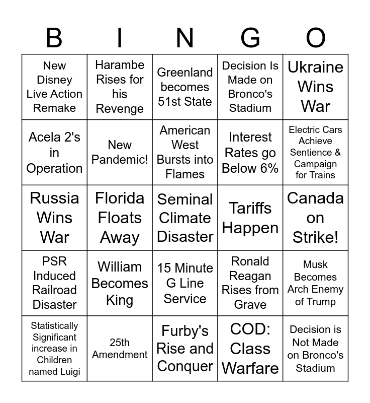This bingo card has a free space and 24 words: William Becomes King, 25th Amendment, American West Bursts into Flames, Statistically Significant increase in Children named Luigi, Ukraine Wins War, New Disney Live Action Remake, Acela 2's in Operation, Harambe Rises for his Revenge, Tariffs Happen, 15 Minute G Line Service, Interest Rates go Below 6%, Russia Wins War, Ronald Reagan Rises from Grave, Musk Becomes Arch Enemy of Trump, New Pandemic!, COD: Class Warfare, Canada on Strike!, Greenland becomes 51st State, Electric Cars Achieve Sentience & Campaign for Trains, Florida Floats Away, Decision is Not Made on Bronco's Stadium, PSR Induced Railroad Disaster, Decision Is Made on Bronco's Stadium and Furby's Rise and Conquer.