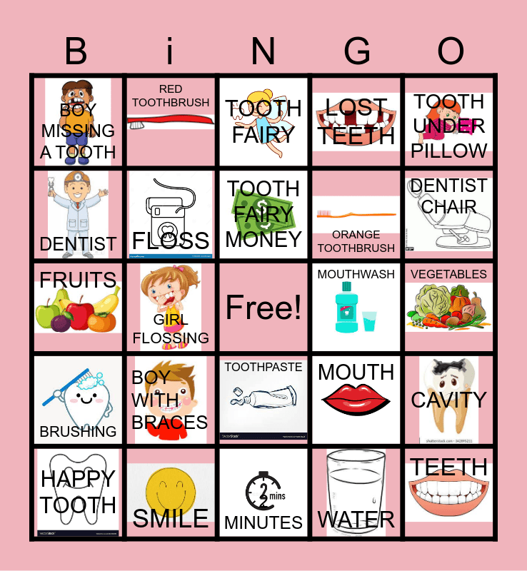 This bingo card has 24 images, a free space and 25 words: HAPPY TOOTH, BOY WITH BRACES, TOOTH FAIRY MONEY, WATER, DENTIST CHAIR, BOY MISSING A TOOTH, RED TOOTHBRUSH, TOOTH FAIRY, ORANGE TOOTHBRUSH, CAVITY, FRUITS, FLOSS, MOUTH, TEETH, DENTIST, SMILE, 2 MINUTES, LOST TEETH, VEGETABLES, BRUSHING, GIRL FLOSSING, TOOTHPASTE, MOUTHWASH, TOOTH UNDER PILLOW and Teeth.