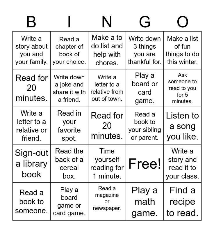 This bingo card has 25 words: Read the back of a cereal box., Read a magazine or newspaper., Write a letter to a relative from out of town., Read a book to someone., Make a list of fun things to do this winter., Write a story about you and your family., Read for 20 minutes., Read a chapter of book of your choice., Read a book to your sibling or parent., Time yourself reading for 1 minute., Play a board or card game., Write a letter to a relative or friend., Free!, Write a story and read it to your class., Write down a joke and share it with a friend., Find a recipe to read., Listen to a song you like., Make a to do list and help with chores., Ask someone to read to you for 5 minutes., Read in your favorite spot., Read for 20 minutes., Play a board game or card game., Sign-out a library book, Write down 3 things you are thankful for. and Play a math game..