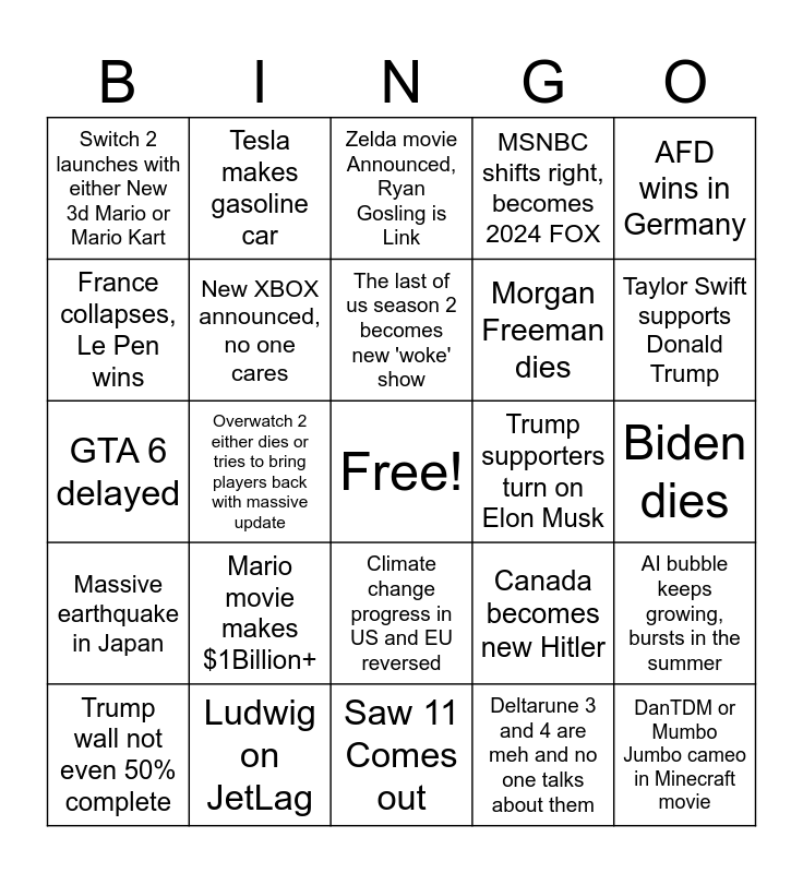 This bingo card has a free space and 24 words: Mario movie makes $1Billion+, Ludwig on JetLag, The last of us season 2 becomes new 'woke' show, Trump wall not even 50% complete, AFD wins in Germany, Switch 2 launches with either New 3d Mario or Mario Kart, France collapses, Le Pen wins, Tesla makes gasoline car, Trump supporters turn on Elon Musk, Climate change progress in US and EU reversed, Morgan Freeman dies, GTA 6 delayed, Canada becomes new Hitler, AI bubble keeps growing, bursts in the summer, New XBOX announced, no one cares, Deltarune 3 and 4 are meh and no one talks about them, Biden dies, Zelda movie Announced, Ryan Gosling is Link, Taylor Swift supports Donald Trump, Overwatch 2 either dies or tries to bring players back with massive update, DanTDM or Mumbo Jumbo cameo in Minecraft movie, Massive earthquake in Japan, MSNBC shifts right, becomes 2024 FOX and Saw 11 Comes out.