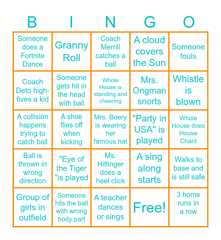 This bingo card has 30 words: Someone hits the ball with wrong body part, Out on first play, A shoe flies off when kicking, Whole Advisory kicks in a round, Someone does a Fortnite Dance, Coach Merrill catches a ball, Someone gets hit in the head with ball, Ms. Hittinger does a heel click, "Party in USA" is played, A teacher dances or sings, Whole House does House Chant, Mrs. Beery is wearing her famous hat, Free!, 3 home runs in a row, Whistle is blown, Mr. Pullman plays an "Old person song", A sing along starts, Ball is thrown in wrong direction, "Eye of the Tiger "is played, Someone fouls, A collision happens trying to catch ball, Someone slides, Granny Roll, Mrs. Ongman snorts, Coach Deto high-fives a kid, A cloud covers the Sun, Walks to base and is still safe, Group of girls in outfield, Whole House is standing and cheering and Someone gets caught in a "Pickle".