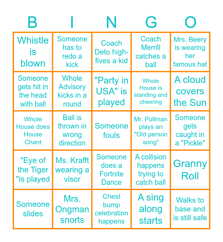 This bingo card has 35 words: Someone hits the ball with wrong body part, Out on first play, A shoe flies off when kicking, Whole Advisory kicks in a round, Someone does a Fortnite Dance, Coach Merrill catches a ball, Someone gets hit in the head with ball, Ms. Hittinger does a heel click, "Party in USA" is played, A teacher dances or sings, Whole House does House Chant, Mrs. Beery is wearing her famous hat, Free!, 3 home runs in a row, Whistle is blown, Mr. Pullman plays an "Old person song", A sing along starts, Ball is thrown in wrong direction, "Eye of the Tiger "is played, Someone fouls, A collision happens trying to catch ball, Someone slides, Granny Roll, Mrs. Ongman snorts, Coach Deto high-fives a kid, A cloud covers the Sun, Walks to base and is still safe, Group of girls in outfield, Whole House is standing and cheering, Someone gets caught in a "Pickle", All your House teachers are wearing House color, Chest bump celebration happens, Ms. Krafft wearing a visor, Someone has to redo a kick and Mrs. Ongman says "If you can hear me".