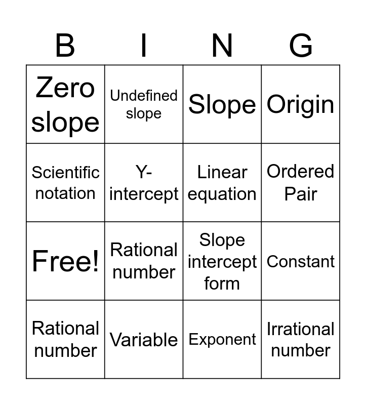 This bingo card has 20 words: Constant, Positive slope, Slope, Repeating decimal, Rational number, Scientific notation, Variable, Zero slope, Free!, Undefined slope, Rational number, Slope intercept form, Y-intercept, Irrational number, Linear equation, Negative slope, Ordered Pair, Origin, Exponent and Base.